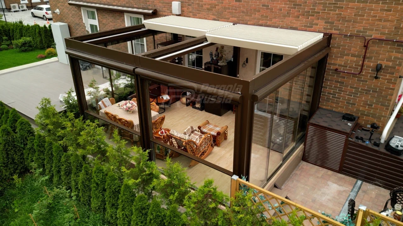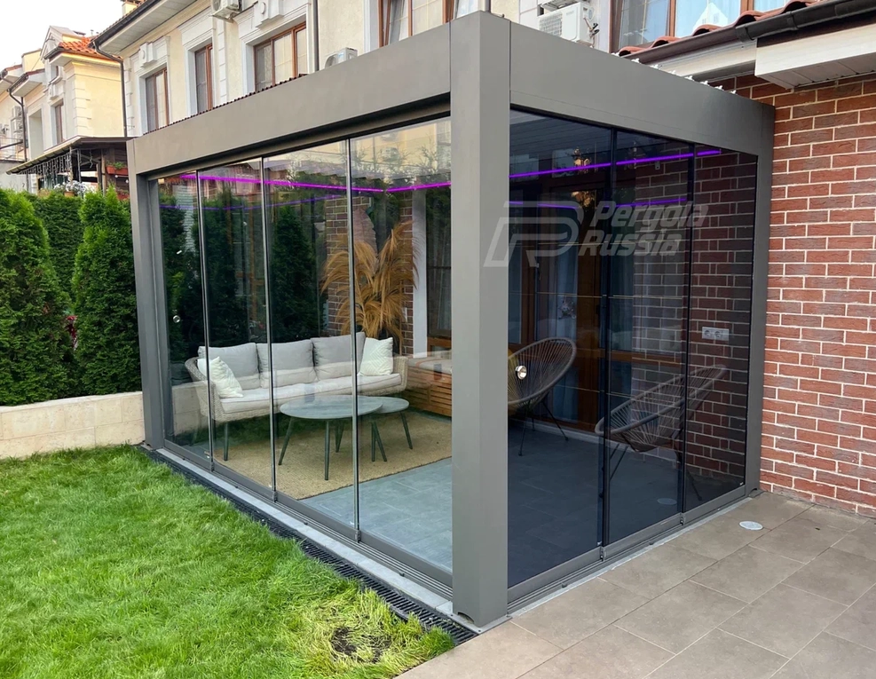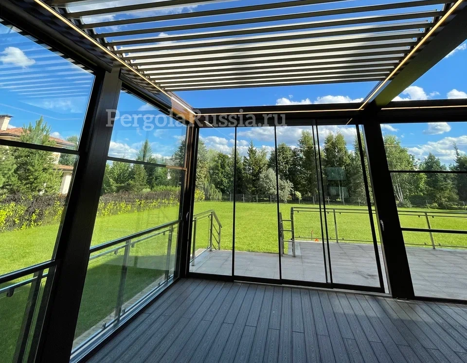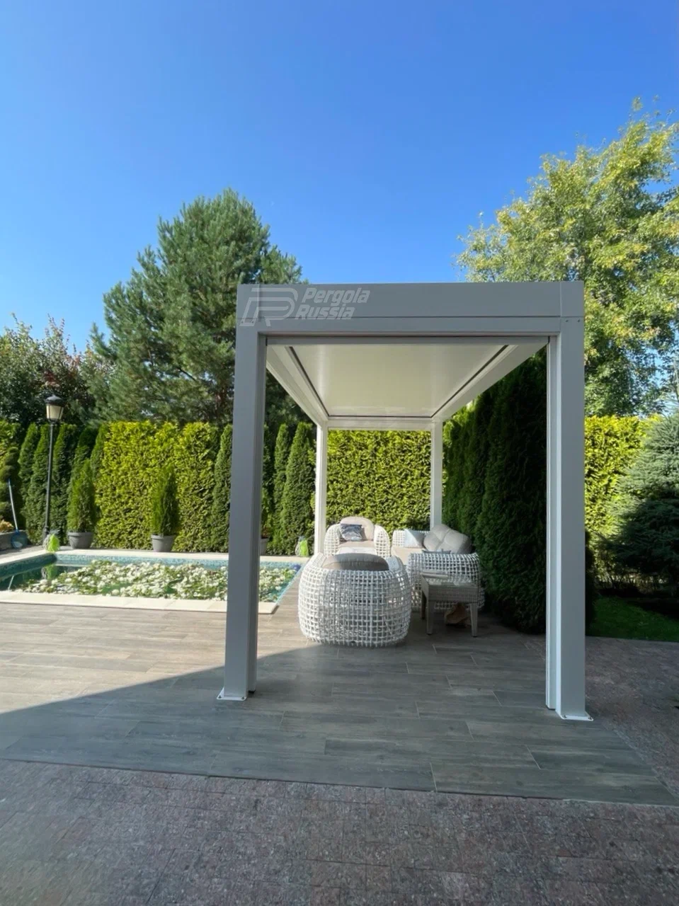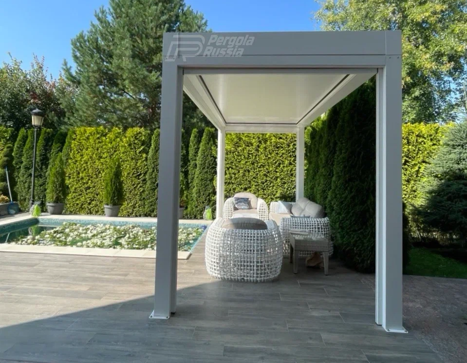 Перголы оснащены сдвижными механизмами на крыше и стенах, что позволяет легко изменять конфигурацию в зависимости от погоды. С использованием современной автоматизации можно интегрировать управление в систему "умный дом".
