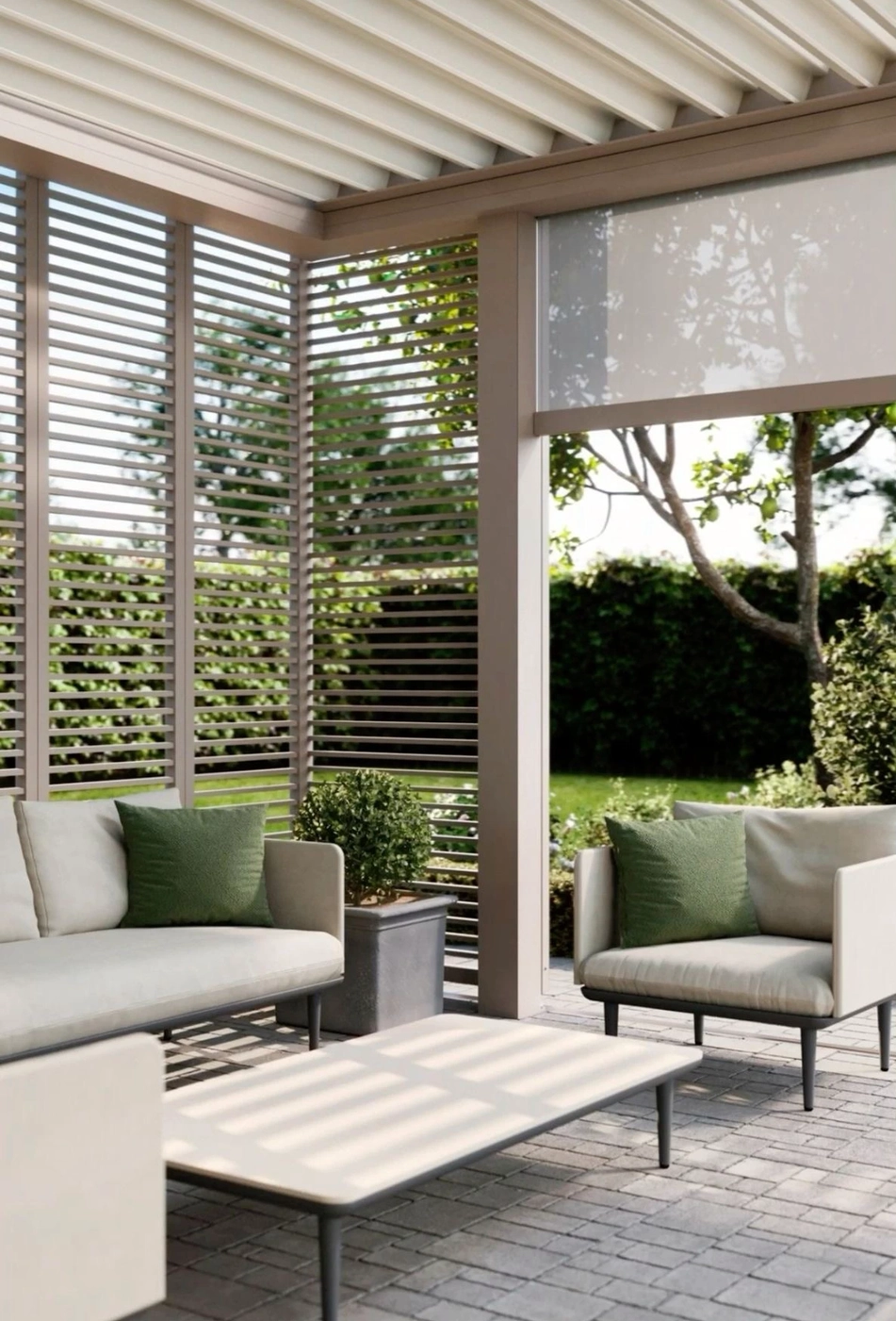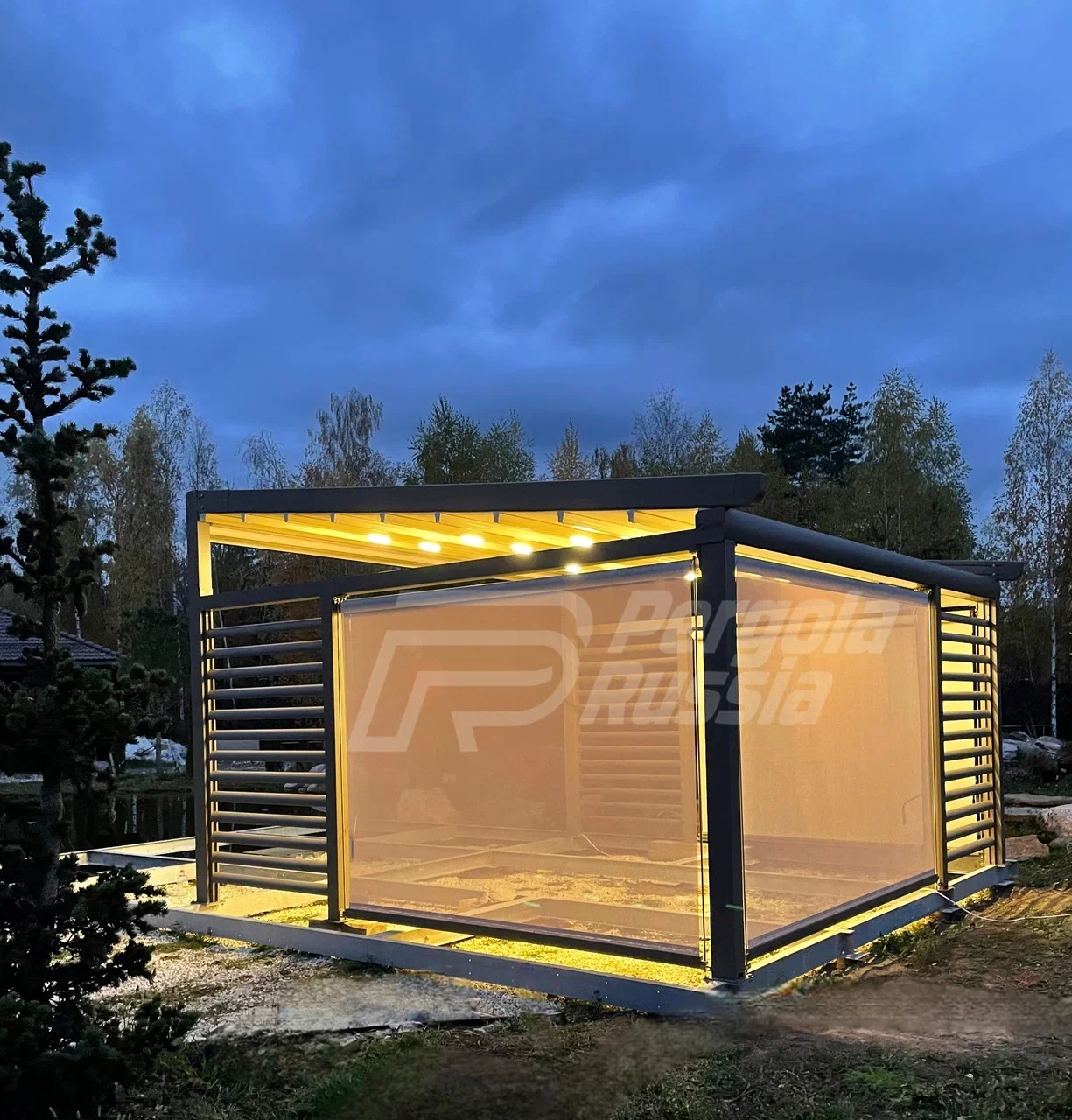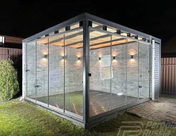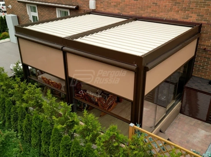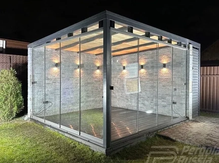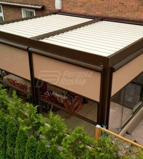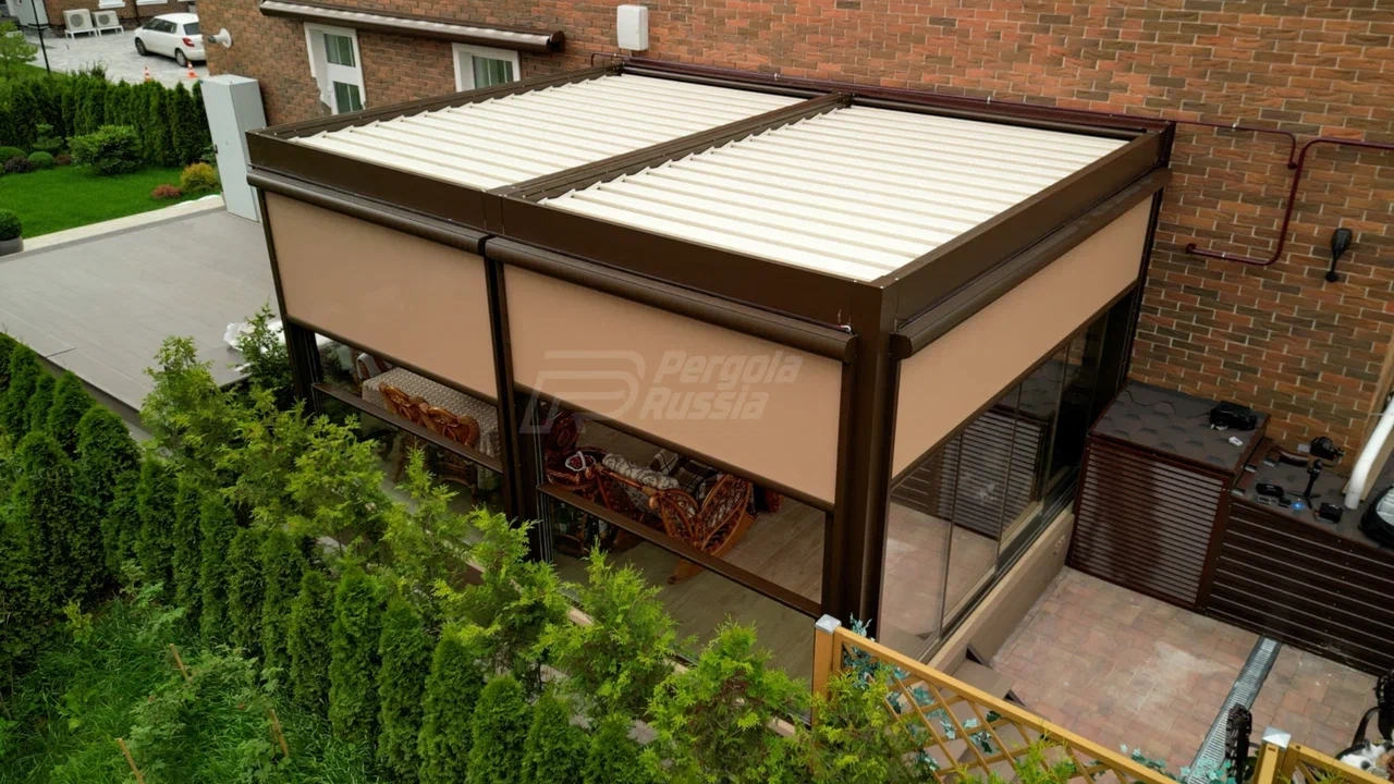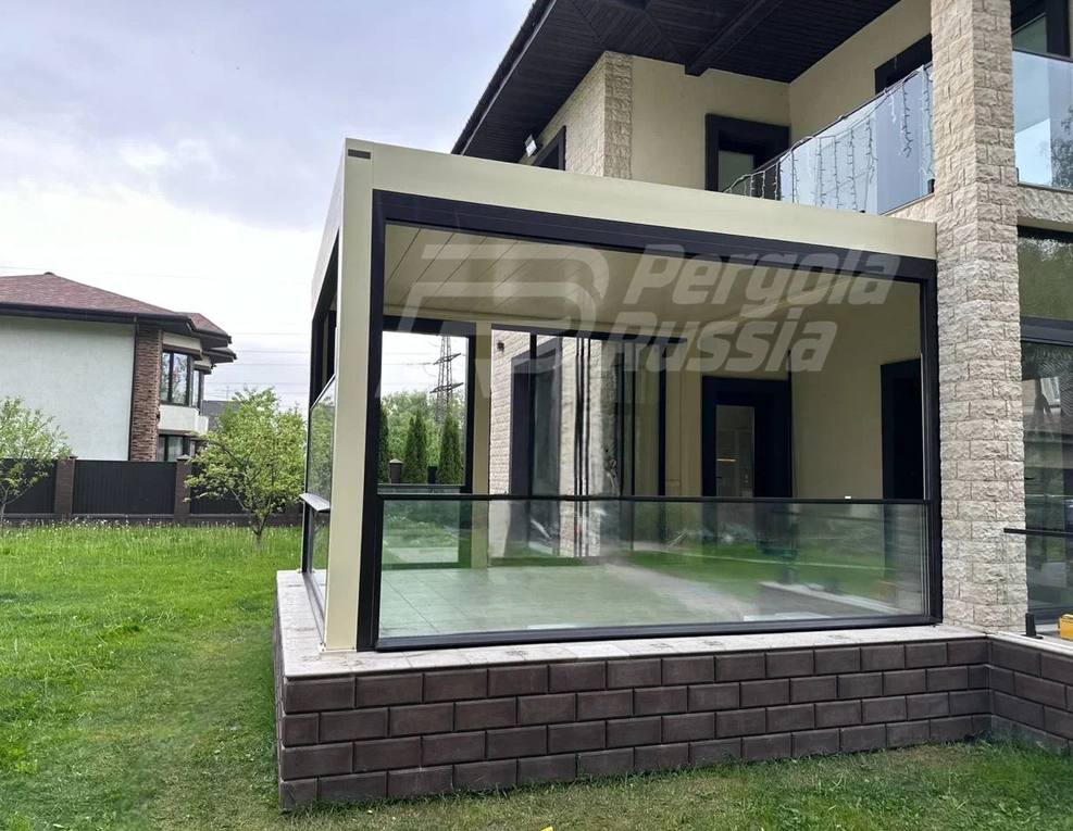 Перголы оснащены сдвижными механизмами на крыше и стенах, что позволяет легко изменять конфигурацию в зависимости от погоды. С использованием современной автоматизации можно интегрировать управление в систему "умный дом".