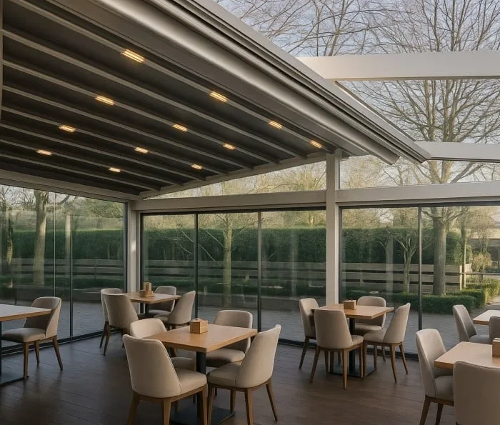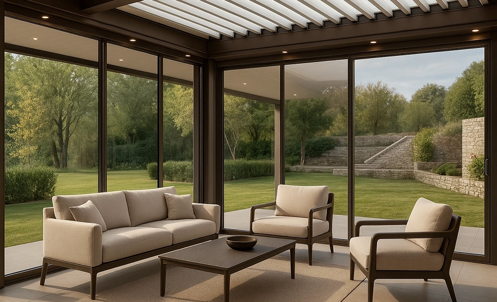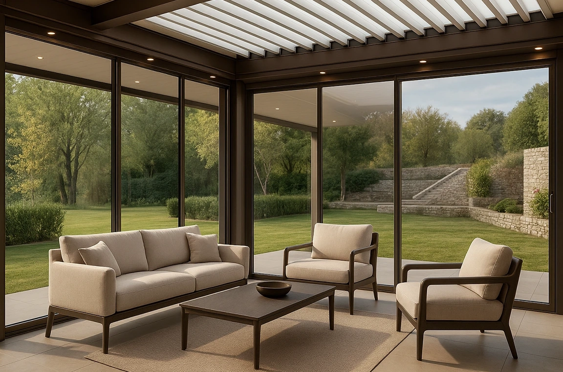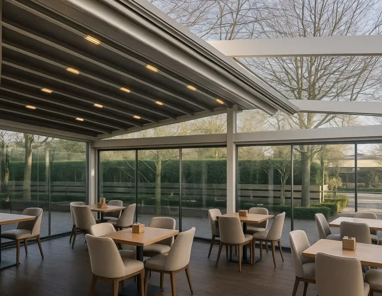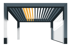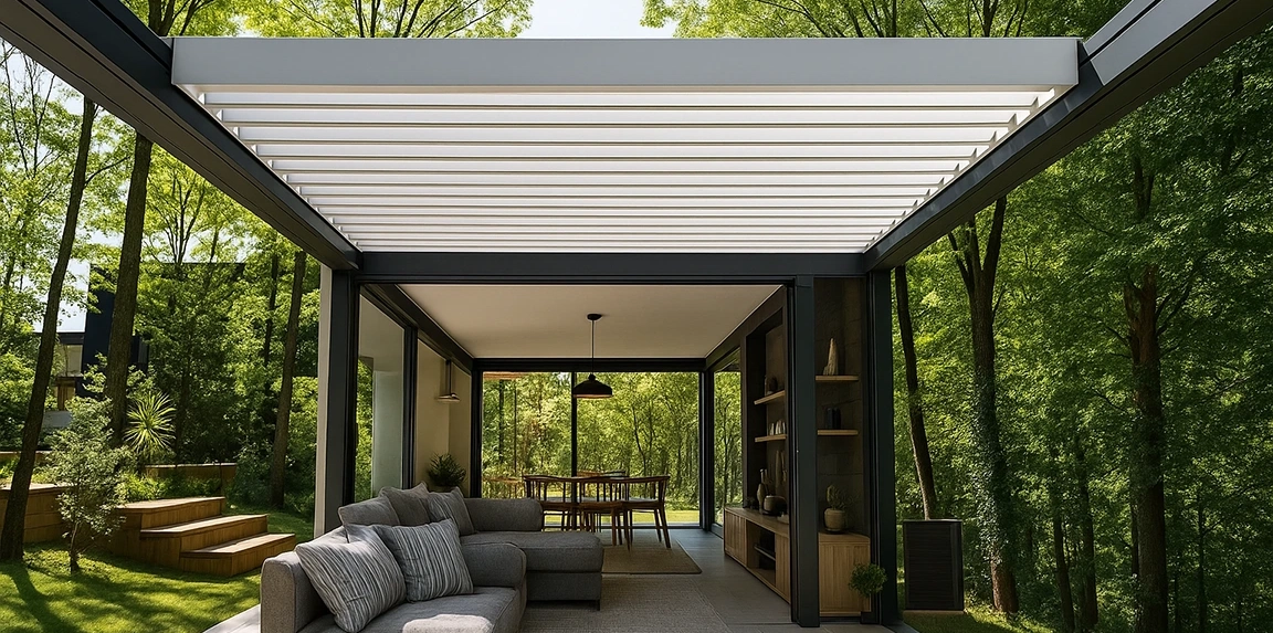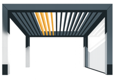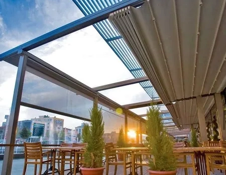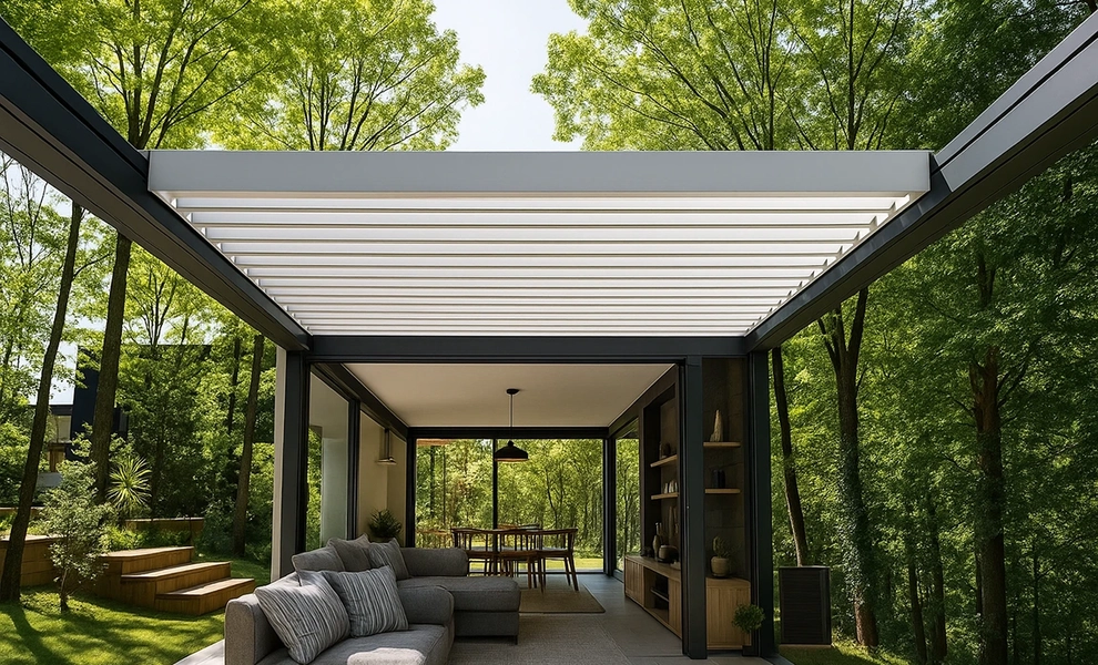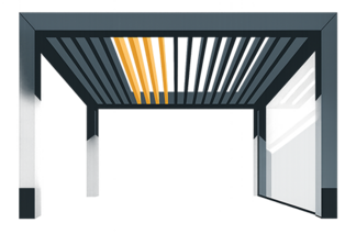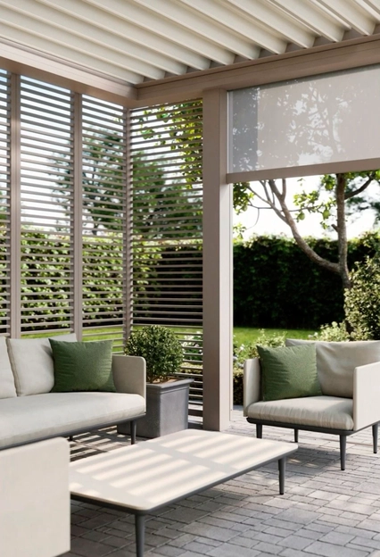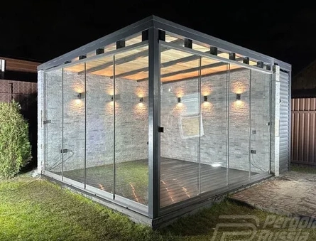 Перголы оснащены сдвижными механизмами на крыше и стенах, что позволяет легко изменять конфигурацию в зависимости от погоды. С использованием современной автоматизации можно интегрировать управление в систему "умный дом".