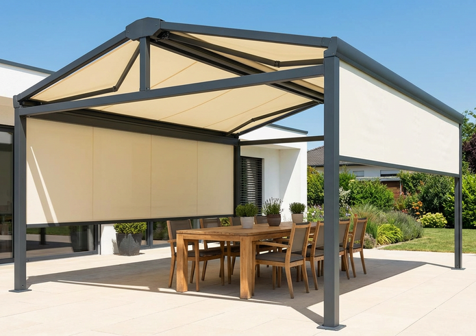 Да, двускатная пергола может стать основой для всесезонного пространства, если правильно спроектировать её под климат и сценарии использования. Для этого закладывается достаточный запас по снеговой и ветровой нагрузке, подбираются прочные кровельные материалы и продуманная система водоотвода. По периметру можно установить безрамное или рамное остекление, подъёмное гильотинное остекление или ZIP‑системы, которые защищают от ветра, осадков и удерживают тепло.